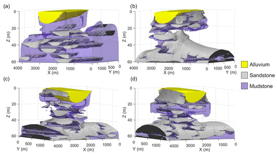 Saturated alluvium, sandstone, and mudstone volumes for examples of realizations with (a) 20% and (b) 75% bedrock sandstone fractions and (c) lowest and (d) highest A-B flow rates for 50% bedrock sandstone fraction.