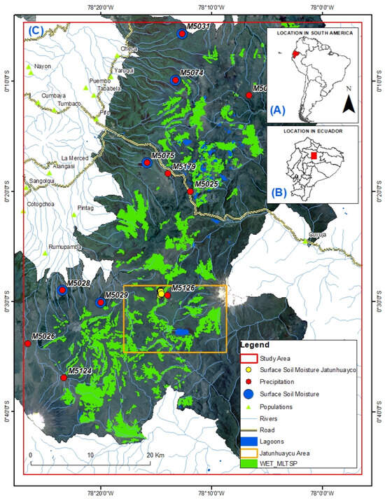 Study Area. (A) Ecuador is located in eastern South America. (B) The FONAG/EPMAPS hydrological interest area (red polygon) is located in the northern Ecuadorian Andes. (C) Additionally, based on data availability of SSM data provided by Paez-Bimos, an area called the Jatunhuayco area (orange polygon) has been defined. Red points represent the 11 stations that characterize the precipitation, blue points represent the stations that have SSM measurements available, yellow points represent the SSM measurements in the Jatunhuayco area, and green polygons represent the wetlands identified by FONAG, 2022 through the Planet image (WET_MLTSP).