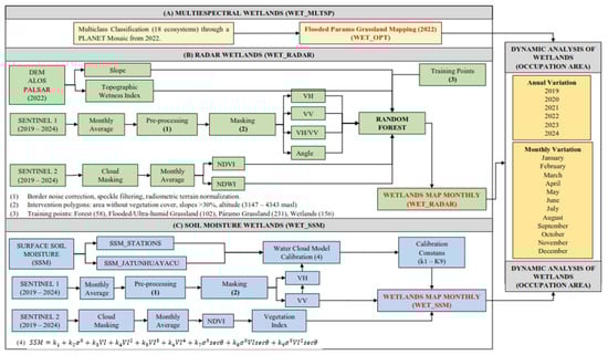 Methodology for dynamic mapping wetlands (A) WET_ OPT developed by FONAG, 2022. (B) WET_RADAR uses radar (Sentinel-1) and multispectral (Sentinel-2) information and a RF in GEE. (C) WET_MLTSP uses SSM data from the stations and the Jatunhuayco area to calibrate WCM, and the mapping is executed in GEE.