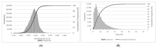 (A) Elevation histogram (m.a.s.l) of wetlands identified by multispectral image. The maximum altitude value recorded in the multispectral wetlands corresponds to 5650 m.a.s.l, while the mode corresponds to 4056 m.a.s.l. The value that covers 95% of the observations is 4343 m.a.s.l. (B) Slope histogram (%) of wetlands identified by multispectral image. The maximum slope value recorded in the multispectral wetlands corresponds to 73%, while the mode corresponds to 4%. The value that covers 95% of the observations is 25%.