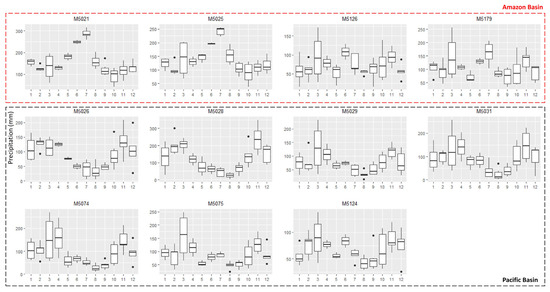The monthly analysis has established that two precipitation regimes are observed in the study area (Figure 4). The first regime, characterized by the seven stations located on the Pacific Basin (M5031, M5074, M5075, M5028, M5029, M5026, and M5124), registers high precipitation indices in March and November, while August corresponds to the month with the lowest precipitation indices. The second precipitation regime corresponds to the four stations located on the Amazon Basin (M5021, M5179, M5025, M5126). These stations register high precipitation indices during the June–July period, while precipitation values decrease in February and October. The analysis at each of the stations in the study area is shown in Figure 5.