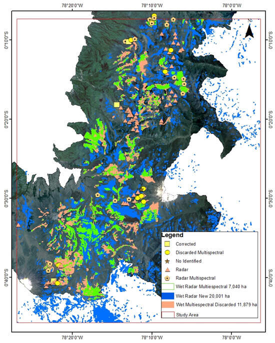 The validation results have established that the percentage of agreement between the FONAG multispectral classifications (2022) and those of WET_RADAR is 19.5%, while newly identified wetlands account for 60.9%. The discarded multispectral information (DISCARDED_ MULTISPECTRAL) corresponds to 14.9%. It is important to highlight that when considering the categories RADAR (53 points), Discarded_ multi-spectral (17 points), CORRECTED (3 points), and DISCARDED_MULTISPECTRAL (13 points), the total percentage is 98.8%, indicating that RADAR classifications exhibit a high correlation with field observations.