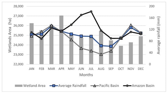 Dynamic analysis of the wetlands has determined that the month with the largest wetland area is April, with 27,041 ha (6.7%), while the month with the smallest area is October, with 23,906 ha (6.0%). This indicates a difference of 3135 ha, an area considered as temporary wetlands. Specifically, in April, the largest wetland area is recorded (27,041 ha). Despite the average precipitation regime decreasing by 17 mm, this phenomenon is presumed to occur because the months preceding April (October to April) register high precipitation values. In other words, the wetlands remain saturated, and despite the 17 mm decrease between March and April, the wetland area increases.