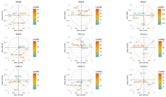 An exploratory Principal Component Analysis (PCA) was conducted, which is a multivariate technique that transforms intercorrelated variables into sets of new linearly orthogonal variables with maximum variance, called principal components [57]. This analysis was performed to preliminarily establish potential correlations between SSM data and VH and VV polarizations. In the PCA graphs, two axes (x, y) are represented, showing combinations of the original variables that explain the greatest variance in the data (dimensions). Vectors are plotted along the axes to represent the variables; the longer the vector, the greater the contribution of that variable to the principal component. The angles between vectors indicate the correlation between variables; angles less than 90° represent a strong positive correlation, orthogonal angles (90°) indicate little to no correlation, and angles of 180° represent negative correlations.