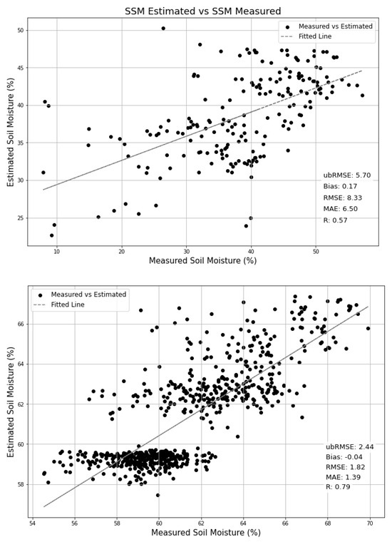 In the context of machine learning, linear regression functions as a fundamental supervised learning algorithm that models the relationship between a set of input variables and a continuous target variable. In this study, multiple linear regression was applied using variables derived from remote sensing data, such as the VV backscatter coefficient, vegetation index (VI), and incidence angle (θ), along with nonlinear interactions and polynomial terms (e.g., VI2, VI3, VV·VI·sec(θ)) as input features. This multivariate model was implemented using Python’s Scikit-learn library, which automatically adjusts the regression coefficients by minimizing the residual errors between observed and estimated SSM values. The resulting model captures the functional behavior of the Water Cloud Model (WCM) and provides interpretable coefficients for each contributing variable, enabling reliable estimation of surface soil moisture under varying vegetation and backscatter conditions from Sentinel-1 polarizations (VH or VV). Additionally, the validation of soil moisture inversion results was evaluated using the following statistical metrics: