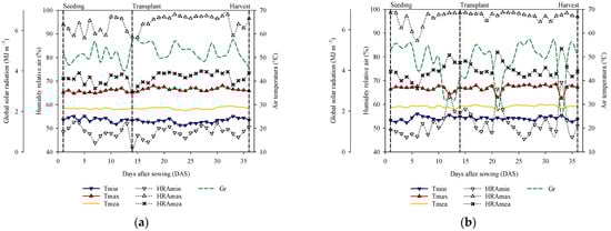 Climatic parameters were monitored daily for the first (Figure 1a) and second (Figure 1b) experiments. The data were obtained with the aid of an automatic weather station—model CR1000 (Campbell Scientific, Ltd., Logan, UT, USA).