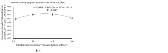 The maximum instantaneous efficiency of plant carboxylation (0.117 and 0.125 µmol CO2 m−2 s−1) was verified for the estimated ECns of 3.95 and 3.92 dS m−1 under the predominance of NaCl or CaCl2 in the water, respectively (Figure 3h,i). The application flow rate also had no effect (p > 0.05) on the maximum instantaneous efficiency of plant carboxylation, with CEi values of 0.103 or 0.111 [µmol CO2 m−2 s−1] under waters prevalent in either NaCl or CaCl2, respectively.
