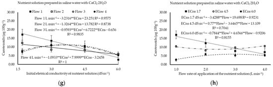 Regarding the predominance of CaCl2, after analysis of each ECns within the proposed range of flow rates (Figure 4h), it was found that the concentration of carotenoids reduced at a rate of 3.43 µg 100 g−1 with each unit of increment in flow rate in the plants exposed to an ECns of 1.7 dS m−1 (Figure 4h). Regarding ECns values of 4.5 and 6.0 dS m−1, minimum and maximum values of 8.78 and 6.04 µg 100 g−1, respectively, were observed (Figure 4h). At an ECns = 3.0 dS m−1, even with a quadratic influence on the levels of carotenoids, the data were not presented in any graphs or tables as the low value of the coefficient of determination was verified (R2 = 0.5311).