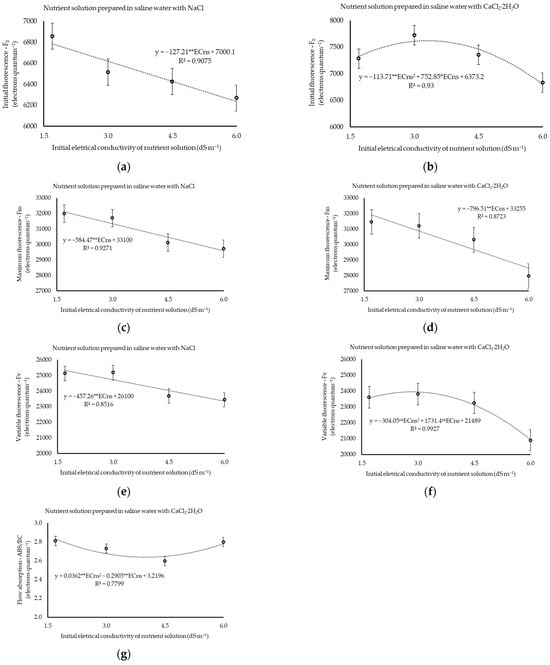 When the water was salinized with CaCl2, the ABS/RC was minimal (2.64 electrons quantum−1) at the estimated ECns of 4.0 dS m−1 (Figure 5g). This variable was not affected (p > 0.05) by either the increase in flow under a prevalence of CaCl2, with a mean value of 2.73 electrons quantum−1, or by the treatments when the plants were exposed to waters salinized with NaCl, resulting in an average value of 2.31 electrons quantum−1.
