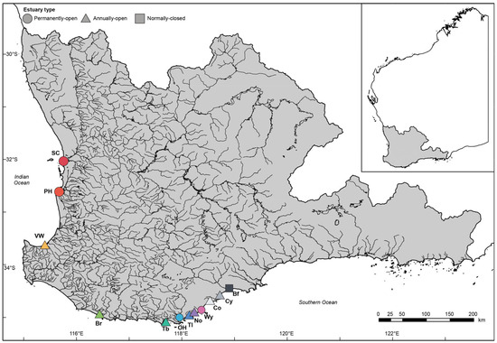 Southwestern Australian estuaries are microtidal and experience a Mediterranean climate, with hot, dry summers and cool, wet winters [31]. Over 85% of rainfall occurs between May and October, and there is a gradient ranging from ~1400 mm per year in the southwestern corner to a minimum of ~400 mm north and eastwards, where it becomes more variable [32]. These conditions result in some of the estuaries becoming disconnected from the ocean for several years at a time and, if rainfall is low, evaporation can cause them to be amongst the most hyperhaline globally [33,34].