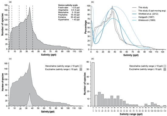 (a) The number of benthic macroinvertebrate taxa in southwestern Australian estuaries recorded in each salinity increment (1 ppt), (b) relationship between the number of taxa expressed as a percentage of the maximum value and salinity found in southwestern Australia and various authors’ modifications to the Remane diagram [28,29,30], (c) the number of stenohaline and euryhaline species in each salinity increment, and (d) the number of taxa within each salinity range, defined by the difference between the minimum and maximum salinity that each taxon was recorded in. Dashed lines in (a) denote boundaries between salinity categories on the Venice salinity scale.