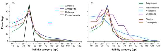 Among the phyla, arthropods were recorded in all salinity categories, with annelids only absent from salinities > 111 ppt and molluscs from those >100 ppt (Figure 3a). In contrast, echinoderms were restricted to euryhaline conditions (31–40 ppt). The percentage richness of arthropod, annelid, and mollusc taxa increased sequentially to a peak in euhaline conditions (31–40 ppt) before declining rapidly, with only 19, 11, and 13% of taxa recorded in salinities > 50 ppt. The pattern for these three phyla was mirrored by those for polychaetes, malacostracans, gastropods, and particularly bivalves, which were not recorded in salinities > 60 ppt (Figure 3b). However, that for hexapods was different, with the percentage richness being similar in salinities between 0 and 30 ppt (~67%) before declining more gradually and remaining > 10% until salinity exceeded 100 ppt.