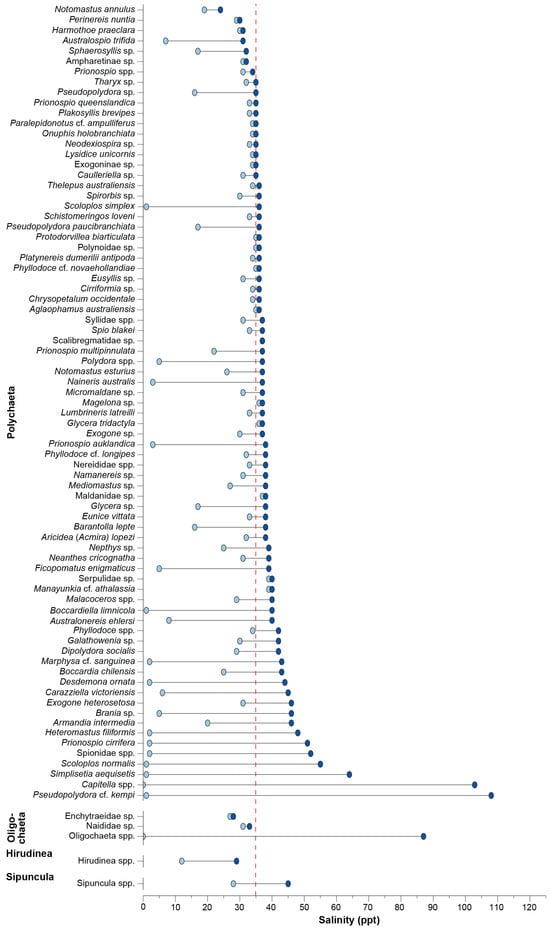 Dumbbell plot of the minimum and maximum salinity in which each annelid taxon was recorded. The dashed red line denotes salinity around full-strength seawater.