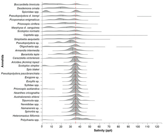 Ridgeline plot of the frequency distribution of each annelid taxon recorded in ≥10 samples across the salinity gradient. The dashed red line denotes salinity around full-strength seawater and the black vertical solid lines indicate the median salinity of each taxon generated by the kernel density estimation.