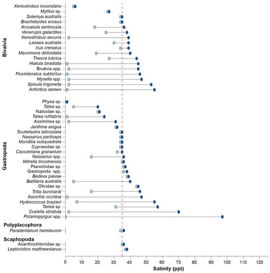 Dumbbell plot of the minimum and maximum salinity in which each molluscan taxon was recorded. The dashed red line denotes salinity around full-strength seawater.