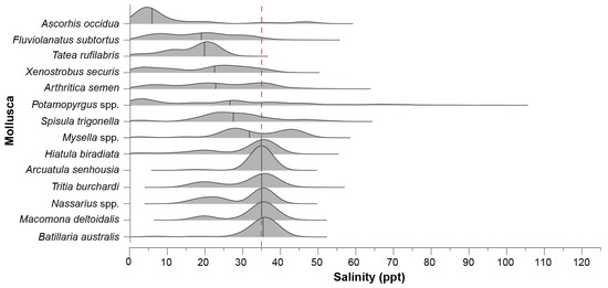 Ridgeline plot of the frequency distribution of each molluscan taxon recorded in ≥10 samples across the salinity gradient. The dashed red line denotes salinity around full-strength seawater and the black vertical solid lines indicate the median salinity of each taxon generated by the kernel density estimation.