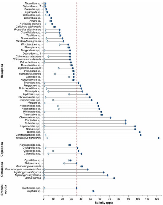 Dumbbell plot of the minimum and maximum salinity in which each hexapod, copepod, ostracod, and branchipod taxon was recorded. The dashed red line denotes salinity around full-strength seawater.