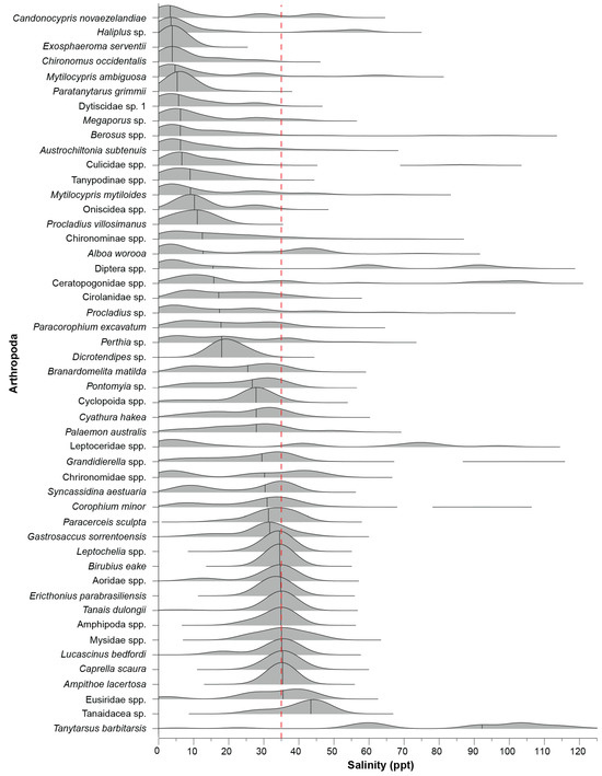 Ridgeline plot of the frequency distribution of each arthropod taxon recorded in ≥10 samples across the salinity gradient. The dashed red line denotes salinity around full-strength seawater and the black vertical solid lines indicate the median salinity of each taxon generated by the kernel density estimation.