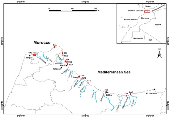 Location of the surveyed beaches along the study area. ((BAD) Bades, (CIR) Cala Iris, (JEB) Jebha, (STE) Stehat, (QAS) Quaa Assrasse, (OLA) Oued Laou, (MAR) Martil, (CNE) Cabo Negro, (RIN) Rincon, (RES) Restinga, (TPI) Tres Piedras, (DAL) Dalia, (TMU) Tangier Municipal, and (TMA) Tangier Malabata.