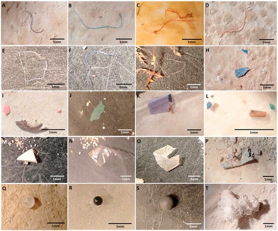 Examples of microplastic types found in the sediments of the studied beaches. ((A–F) Filaments, (G) fibers, (H–M) fragments, (N–P) films, (Q–S) pellets, and (T) foam). Scale bar: 1 mm.
