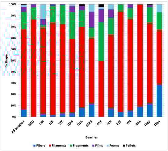 Microplastic samples were categorized into different types based on their morphology, including fibrous MPs (filaments and fibers), fragments, films, foams, and pellets. Examples of different types of microplastics collected from the 14 beaches are shown in Figure 2. Fibrous MPs were the most prevalent type, accounting for 77.61% (1934 items) of the total MPs detected (filaments: 71.03%, fibers: 6.58%), followed by fragments (15.65%, 390 items), films (4.49%, 112 items), foams (1.85%, 46 items), and pellets (0.40%, 10 items) (Table 1 and Figure 3). These results are comparable to those reported on other Moroccan beaches, i.e., in the eastern part of the Mediterranean [28] and in the central part of the Atlantic [51].