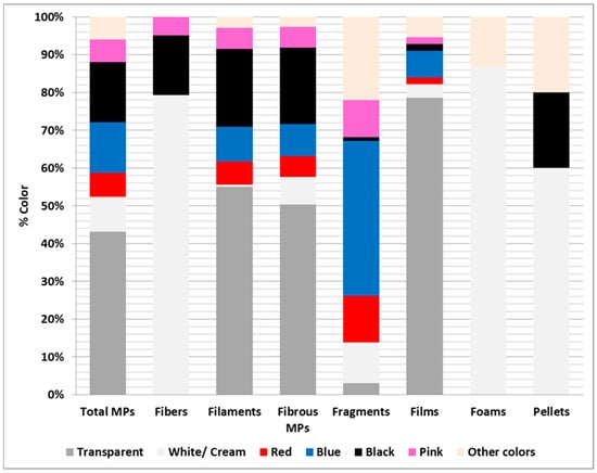 In the present paper, the MPs identified showed different colors, which is consistent with other MP studies [28,58,66,84,85], indicating that microplastic particles come from a variety of sources [20]. Transparent (43.1%) and black (16%) were the dominant MP colors, followed by blue (13.3%), white (9.3%), red (6.3%), and pink (5.9%). The remaining 6% was made up of green, orange, brown, yellow, and violet particles (Figure 4).