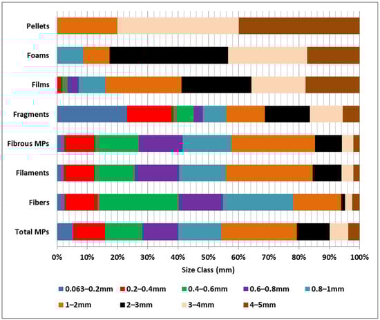 The MPs detected in this paper were mainly categorized into nine subcategories based on their size (Figure 5), with an overall average size of 1.42 ± 1.14 mm. Pellets had the largest average major dimension (3.70 ± 1.07 mm), followed by foams (2.99 ± 1.31 mm), films (2.66 ± 1.31 mm), fragments (1.48 ± 1.42 mm), filaments (1.31 ± 0.98 mm), and fibers (1 ± 0.89 mm). The findings of the ANOVA F test indicated that there was a statistically significant variation (p < 0.05) between sampling sites for size fractions of 0.2–0.4 (p = 0.073), 0.8–1 (p = 0.004), 1–2 (p = 0.001), and 2–3 mm (p = 0.000); however, there was no statistical difference (p > 0.05) for sizes of 0.063–0.2 (p = 0.633), 0.4–0.6 (p = 0.003), 0.6–0.8 (p = 0.245), 3–4 (p = 0.261), and 4–5 mm (p = 0.073). Large MPs (LMPs: 1–5 mm) accounted for 45.7% (1138 items), while small MPs (SMPs: <1 mm) accounted for 54.3% (1354 items).