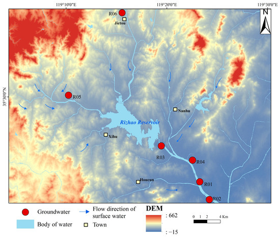 This research selected six monitoring points in the upstream and downstream regions of the Rizhao reservoir, with a sampling period spanning from 2018 to 2023. Samples were collected twice annually during the dry and wet seasons. In this study, monitoring wells were drilled at the selected points to depths of 13.7, 15, 7.45, 11.6, 2.65, and 6.5 m. During the dry season, the average groundwater level at these sampling points was 4.06 m, whereas during the wet season, it was 3.33 m. To ensure the freshness of the samples, two 500 milliliter polyethylene bottles were used at each sampling point and drawn steadily for 5 to 10 min before sampling. Each sampling bottle was rinsed at least three times with the groundwater to be sampled, ensuring that the water samples were free of impurities. After filling the bottles completely and removing any air bubbles, they were labeled, refrigerated, and transported to the laboratory for water quality testing within a week. Comprehensive water quality analyses were conducted in the laboratory. The pH value was determined with an acidity meter (PHS-3C, REX, Shanghai, China), while cations (e.g., Na+, Ca2+, etc.), total dissolved solids (TDS), and total hardness (TH) were analyzed using an inductively coupled plasma emission spectrometer (ICP, Optima 7000DV, PerkinElmer, Waltham, MA, USA). Inductively coupled plasma emission spectroscopy does not directly yield TDS and TH values. However, these parameters can be calculated from data obtained through ICP measurements. Anions (e.g., Cl−, SO42−, etc.) were measured using an ion chromatograph (ICS-600, Thermo Fisher, Waltham, MA, USA), with bicarbonate (HCO3−) determined by titration. To ensure data accuracy, charge balance error (CBE) calculations were conducted on all water samples. The results showed that the CBE values for all samples were within ±5%, thereby validating the reliability of the groundwater monitoring in this study [31].
