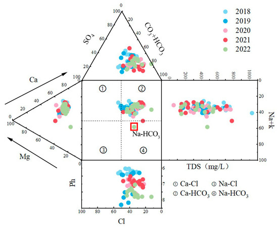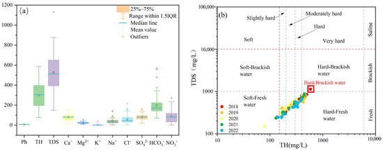 Table 1 and Figure 2 present the findings of monitoring points in RZR from 2018 to 2023. The pH in RZR varied between 6.52 and 8.79, with a mean of 7.46, indicative of a weakly alkaline groundwater environment. TH values spanned from 78.18 mg/L to 586.47 mg/L, averaging 300.90 mg/L.TDS varied between 149.62 mg/L and 1130.02 mg/L, averaging 519.17 mg/L. Based on classifications of TDS and TH, the majority of groundwater samples from RZR are categorized as freshwater (TDS < 1000 mg/L), with only one sample from 2018 exceeding this threshold, classifying it as brackish water. In terms of hardness, the majority of samples were categorized as microhard or hard water. Although the distribution of water samples in the graph shows minor annual variations, the overall stability suggests that the chemical properties of the groundwater have remained relatively consistent over the study period.
