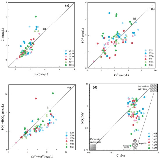 The analysis of the properties and interrelationships of major ions in groundwater is a crucial tool for identifying their sources [34]. The primary origin of Na+ and Cl− ions in groundwater is the dissolution of halite within sedimentary rocks. Theoretically, if the dissolution of halite is the main source of these ions, the concentration ratio of Na+ to Cl− would be expected to be 1:1 [35]. However, data from groundwater monitoring in RZR between 2018 and 2023 reveal a different pattern (as shown in Figure 4a). Most samples exhibit Na/Cl ratios exceeding 1, with some data points clustering near or straddling the Na/Cl = 1 line. Na+ and Cl− in water samples located on the 1:1 line primarily originate from the dissolution of halite. For water samples positioned to the right of the 1:1 line, the relatively high Na+ content may stem from the dissolution of silicate rocks or sodium ion exchange processes. Conversely, Cl− ions in samples on the left side of the line are likely influenced by anthropogenic activities. However, the relatively small number of water sample points falling on the 1:1 line suggests that salt-rock dissolution is not a major source of these ions. Therefore, changes in the concentrations of Na+ and Cl− in groundwater are likely the result of multiple interacting factors. Therefore, the variations in sodium and chloride ion concentrations in groundwater are likely the result of multiple interacting factors.
