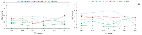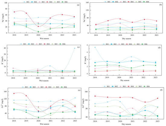 Regular monitoring of groundwater indicators facilitates the rapid identification of water quality trends and enables in-depth analysis of groundwater quality conditions [39]. These analyses furnish vital scientific evidence for the rational utilization of groundwater. In this study, data from six monitoring sites (R01, R02, R03, R04, R05, and R06) in RZR were analyzed over the period from 2018 to 2023. The dynamic changes in the concentrations of major ions during both wet and dry seasons were examined, as illustrated in Figure 5 and Figure 6. Figure 5 specifically depicts the dynamic changes in major cations in groundwater within RZR.