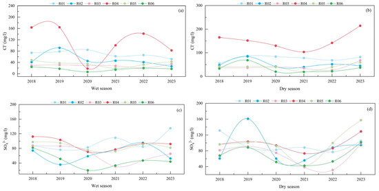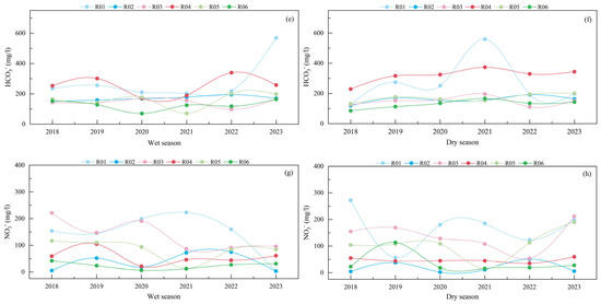 Cl− exhibited a pattern of gradual decrease followed by an increase, with a slow decline in concentration from 2018 to 2020 and a subsequent slow rise from 2020 to 2022. The temporal variation in SO42− exhibited distinct characteristics compared with other parameters, with more pronounced fluctuations observed during the dry season than during the wet season. This pattern may be related to human activities (e.g., see Figure 6c,d). In contrast, HCO3− exhibited relatively stable fluctuations during both the wet and dry season (Figure 6e,f). NO3− displayed significant fluctuations, with relatively high concentrations peaking in 2023 (wet season) and 2018 (dry season). The primary sources of NO3− were domestic sewage discharge and the development of agriculture and animal husbandry.