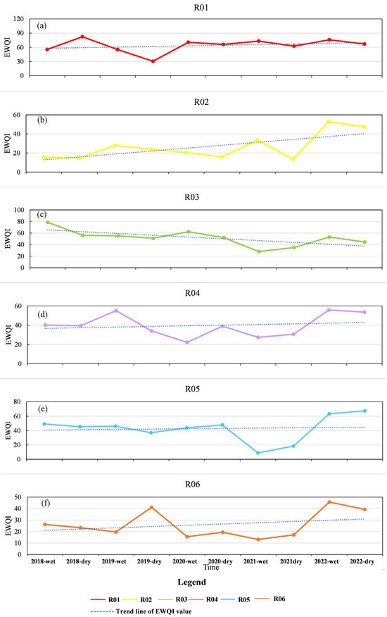 Temporal variation in the EWQI values in groundwater, (a) R01, (b) R02, (c) R03, (d) R04, (e) R05 (upstream water sampling point), (f) R06 (upstream water sampling point).