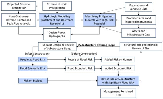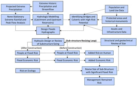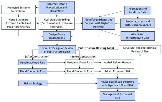 Furthermore, the social and economic impacts of flood risk must be thoroughly evaluated, including people’s exposure to flood hazards, land-use implications, livelihood considerations, and the economic risks associated with flooding. Implementing risk reduction measures around bridges and culverts can significantly decrease future rehabilitation costs and enhance infrastructure resilience. The details of the proposed framework are presented in the following sections.