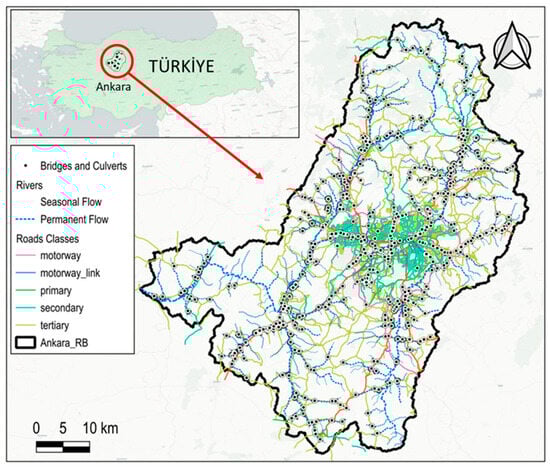 The proposed multi-criteria approach was applied to identify bridges and culverts with high flood risk potential within the Ankara River Basin in response to climate change and environmental and socio-economic considerations. This allowed a systematic identification and assessment of vulnerabilities in existing infrastructure. Various open-source datasets were collected, processed, and analyzed for this analysis to assess flood risk around crossing structures, including culverts, bridges, viaducts, and enclosed conduits within central Ankara. Figure 2 summarizes the components of the proposed framework that were used in implementing the sustainable flood risk-based approach to the existence of bridges and culverts on roads and railways in the Ankara River Basin.