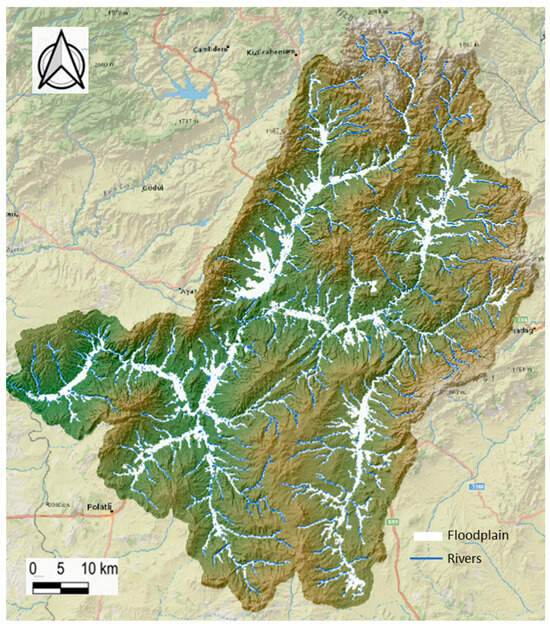 The initial step involved intersecting shapefiles of major roads, such as railways, motorways, primary and secondary roads, tertiary roads, and truck routes, with the streams and the main river of the catchment area. Subsequently, the catchment area and the hydrological characteristics of the streams and rivers at each crossing location were determined using the SWAT+ rev. 61 model. A preliminary floodplain map was then generated with the SWAT+ model to provide an initial assessment of flood-prone areas, as illustrated in Figure 3.