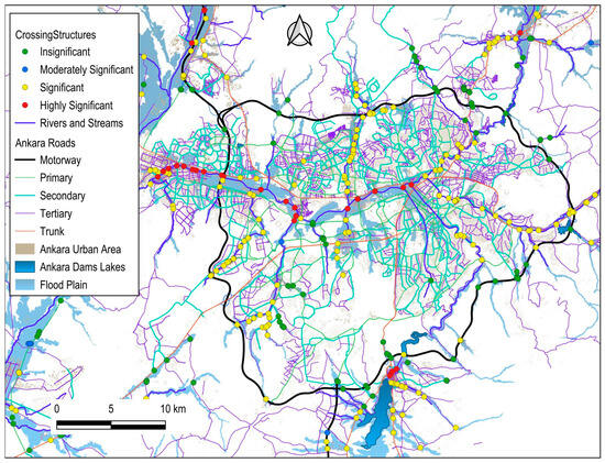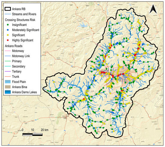 The Ankara River Basin—encompassing Türkiye’s capital city with a population of approximately six million—served as the pilot area for this assessment. A total of 720 bridges and culverts were evaluated using the established framework. Among these, 94 structures were classified as high risk, and 320 were identified as having significant flood risk potential. The methodology incorporated advanced hydrological modeling, geospatial analysis, and socio-economic vulnerability assessment tools (e.g., SWAT+, CORINE land use data, and population datasets). The results confirmed the framework’s efficacy in prioritizing at-risk crossing structures and highlighting the city’s most vulnerable regions. These findings can inform strategic decision-making and support investment prioritization by relevant authorities for flood risk mitigation and infrastructure resilience planning.