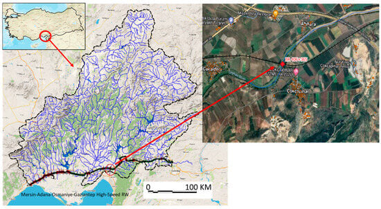 All components of the proposed framework for evaluating the climate change resilience of linear transportation hydraulic structures were assessed through their application to a planned high-speed railway corridor in the Mersin–Adana–Osmaniye–Gaziantep region of Türkiye. The implementation involved complex tasks, including detailed hydrological and hydraulic analyses, drainage area delineation, and flood behavior modeling. At the selected site, the Ceyhan River features broad floodplains on both sides, requiring the simulation of a 26 km river reach. This modeling effort incorporated projected climate change scenarios and evaluated the potential upstream backwater effects extending toward the urban area of Ceyhan City, considering the river’s low bed slope and high hydraulic sensitivity.