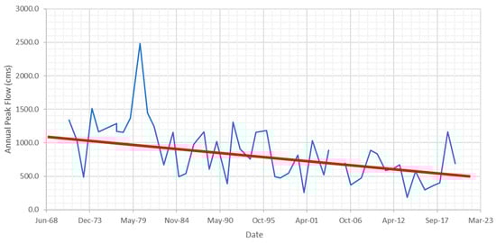 Previous studies using E20A004 (Ceyhan River—Misis Hydrometry Station) peak flow data frequency analysis have considered the 500-year flood peak to be 2218.2 cms; however, evaluating the station data and the dams constructed upstream shows that the time series is not stationary, rendering classical flood frequency analyses invalid. This invalidation arises from the pronounced trend observed in flood peak observations, as depicted in Figure 8.