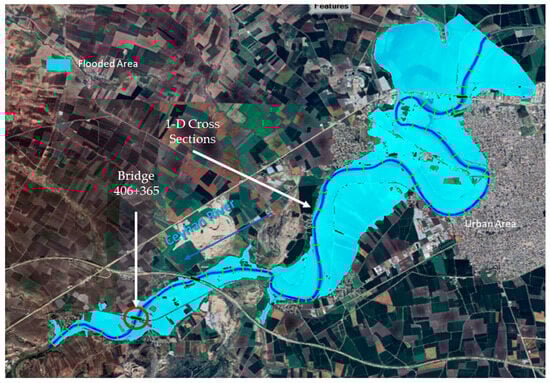 The Ceyhan River at this site has floodplains on both sides. Due to the flat bed slope of the river in the floodplain, a 26 km reach of the river has been simulated, taking into account the climate change scenario and examining the backwater effect upstream to Ceyhan City. The hydraulic model used a refined 2 × 2 m DEM to improve accuracy by removing vegetation, correcting river channels with field data, and analyzing resolution sensitivity. Initially, a 1D model was run for Q500 to examine the stream channel capacity. This indicated that the Q500 flow exceeds the river channel’s capacity, causing the flood to surcharge and propagate into the floodplains. Thus, a 1D/2D model is used to model the bridge’s hydraulics, with detailed terrain modifications and fine grids to accurately capture flow dynamics around the infrastructure. The results of the flood map, profile, and upstream and downstream cross sections of the bridge are presented in Figure 10 and Figure 11. Several simulations were conducted to assess the framework’s results. The bridge design was reviewed, and various operating principles of the upstream reservoirs were examined. The results indicate that the bridge, as is, clears the Q100 and Q500 scenarios. Based on the results, the 500-year flood can pass safely from the bridge location to the deck of the proposed bridge. This bridge is located within the city limits of Ceyhan; therefore, from a standard point of view, it can be designed to withstand a 500-year flood and does not pose a risk to the city.