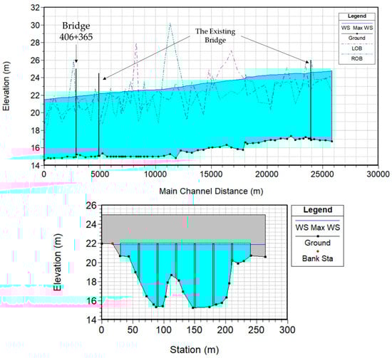 Five-hundred-year flood profile and water level upstream and downstream of Bridge 406+365 on Ceyhan River.