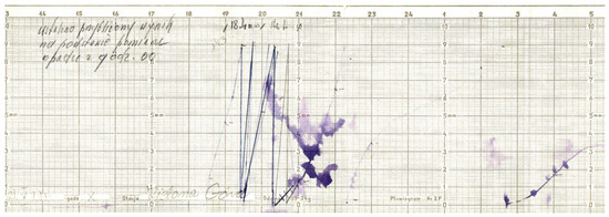 The present investigation utilizes archived pluviograph records from the Institute of Meteorology and Water Management–National Research Institute (IMWM-NRI) meteorological station in Zielona Góra, encompassing the period 1951–2020. These instrumentation-derived data quantify heavy rainfall intensities at ten-minute resolutions and have been systematically aggregated into hourly and daily precipitation totals for subsequent analysis. Figure 1 presents a high-resolution scan of the original paper precipitation strip, which constituted the primary source of gauge data until its digitization in the early 2000s. The exceptional temporal continuity and resolution of this dataset enable robust detection of extreme pluviometric events and facilitate comprehensive trend analysis over seven decades. Consequently, these records represent a critical resource for advancing our understanding of long-term hydrometeorological variability.