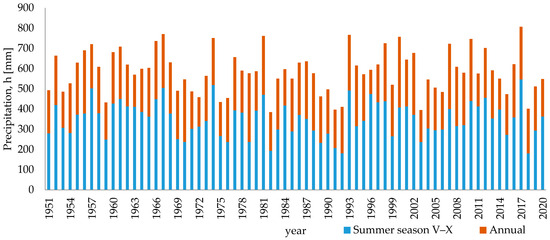 Precipitation amounts, annual and summer season V–X, for the period 1951–2020.