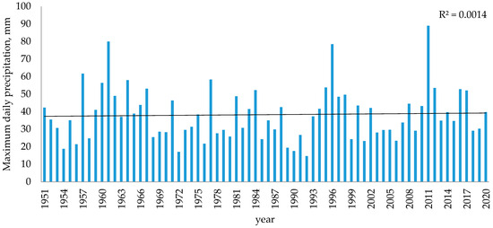 The maximum daily totals recorded t the station varied from 14.7 mm (in 2007) to 89.0 mm (in 2001), while the heaviest day totals in the summer season V–X of the long-term period from 1951 to 2020. There is a statistically insignificant linear change trend detected in the analyzed period, with an R2 coefficient equal to 0.0014. The variability in maximum daily precipitation totals is shown in Figure 4.