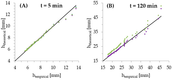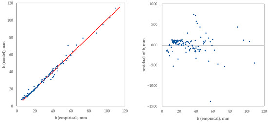 and, thus, random variables are created, which can be generated based on the above formula for any frequency or probability of occurrence. The consistency of measurement data with the model-generated maximum precipitation values can be presented on an h–h plot or q–q plot, where h stands for the rainfall height in [mm], and q stands for the quantile, also in [mm].