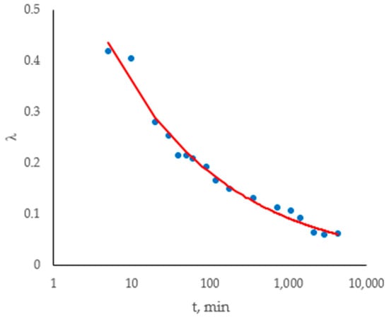 Variation of the GED scale parameter λ as a function of rainfall event duration t for the Zielona Góra pluviograph record (1951–2020).