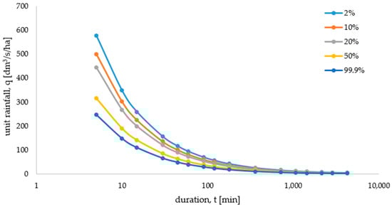 The design and sizing of urban and rural drainage systems are primarily based on the analysis of maximum anticipated rainfall events. Precipitation models, which describe the relationship between rainfall height (h, mm), event duration (t, min), and exceedance probability (p), provide the fundamental basis for this process. Depending on the intended application, rainfall height can be expressed in terms of rainfall intensity (I, mm/min) or unit runoff (q, dm3/s·ha) [1,2].