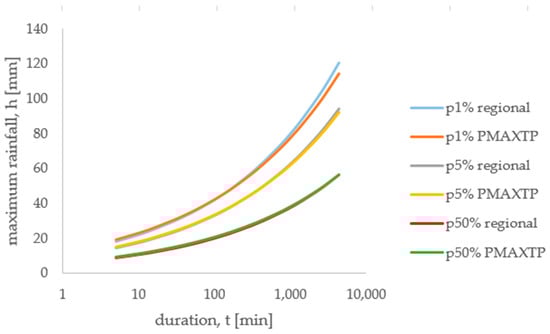 A comparison with PMAXTP values from the IMWM-NRI database, using identical durations and exceedance probabilities (1%, 2%, 5%, 10%, 20%, 33%, 50%, and 99.9%), revealed that for design-relevant thresholds (5–20%), the relative differences between the regional model and the atlas data remained below 1 mm, an amount considered negligible from an engineering standpoint. Larger discrepancies, reaching up to 6.2 mm, were observed only for rare events with a 1% exceedance probability and extended durations of up to 3 days. These findings indicate that despite the PMAXTP atlas being based on a shorter 30-year data record, its spatial interpolation and methodological consistency produce IDF estimates that are effectively comparable to those derived from a longer, locally consistent dataset [38].