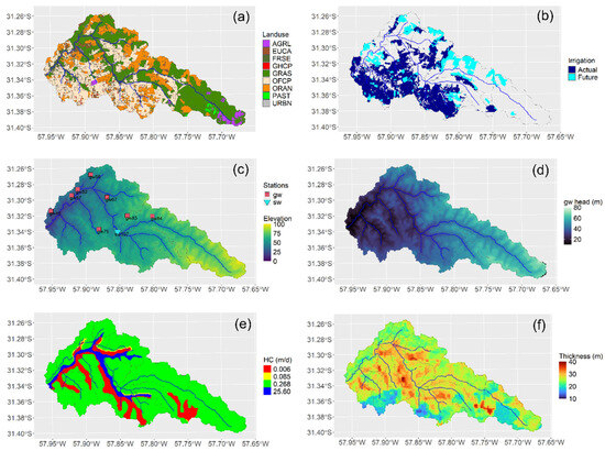 (a) Land use, (b) irrigation scenarios, (c) hypsometry, stations for observation of surface water (sw) and groundwater (gw), (d) steady state hydraulic head, (e) hydraulic conductivity zones, (f) aquifer thickness for the San Antonio catchment—Uruguay.