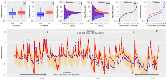 Model performance for streamflow (location: San Antonio at Ruta 3, sw107): (a,b) boxplots, (c,d) probability density function, (e,f) flow duration curves, (g) surface water hydrographs of observations (blue) and simulations (red) for the (a,c,e) calibration, and the (b,d,f) validation periods and 95% of prediction uncertainty (orange).
